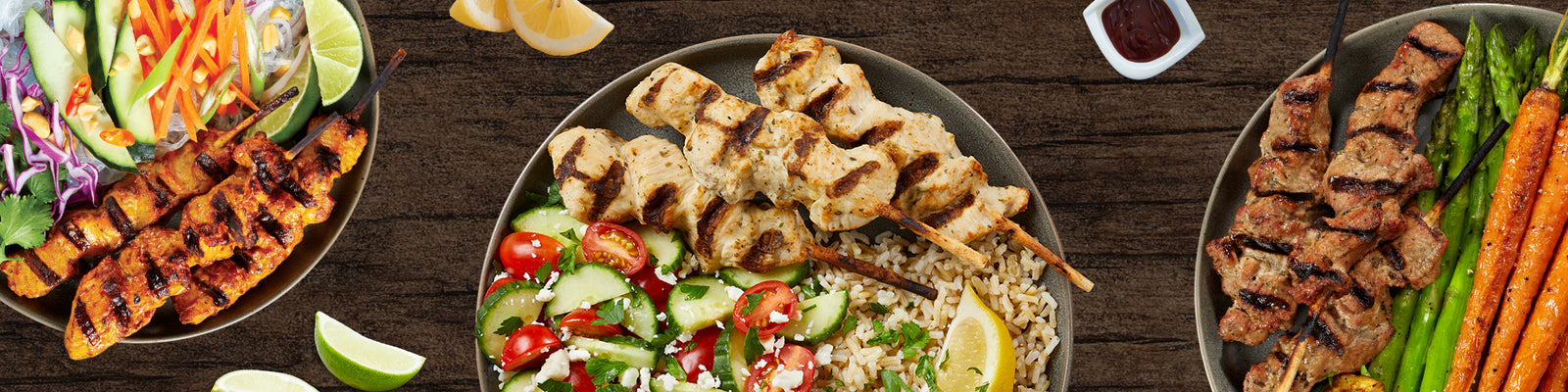 Skewers make for a delicious addition to any meal, party, or barbeque. These skewers are fire-grilled to perfection, making it easy to grab your food and go. Choose between chicken, pork, and beef to find what you like.